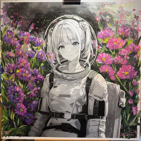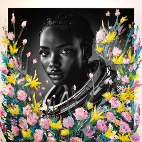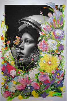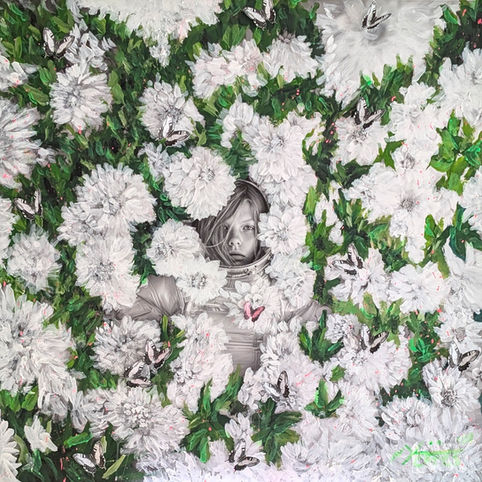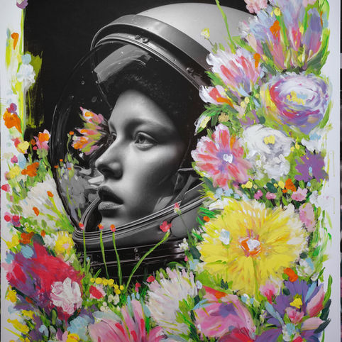 Nature & Technology: Living immersed in the nature of Rovio (Ticino, Switzerland) but deeply connected through tech, Catania paints real local flowers, creating surreal floral constellations that dialogue with the coldness of space.