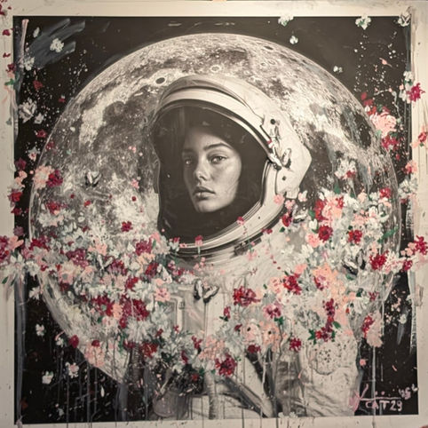 The Female Astronaut as Protagonist: Women take center stage in his universe. His works feature the first woman on the moon and the pioneering "space motherhood" sculpture, beautifully intertwined with flowers photographed at his CasaGalleria.ART atelier in Rovio.