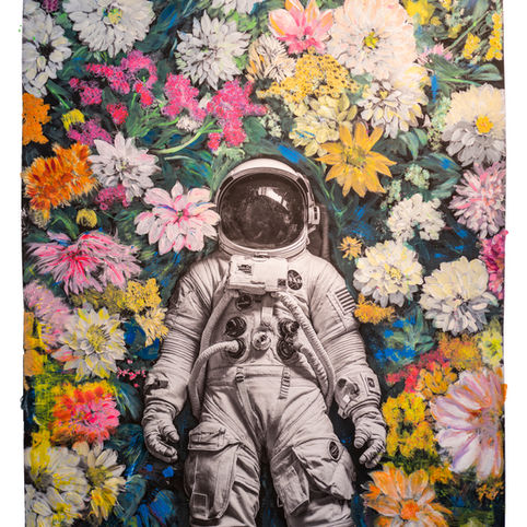 Representing the core of Yuri Catania’s artistic poetics, Yuri in Wonderland is a surreal mixed-media series where constellations of painted flowers meet space exploration. Evolving from his roots as a traditional photographer, Catania moves beyond the camera lens, transforming the night photography of his CasaGalleria.ART garden in Rovio into highly tactile, multi-layered masterpieces.